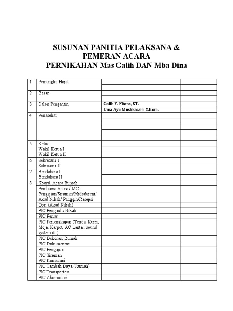 Format susunan panitia pernikahan susunan panitia renderepsi pernikahan menyelenggarakan pesta pernikahan yang sukses tidak dapat dilepaskan dari pihak pihak yang turut berperan of dalamnya.