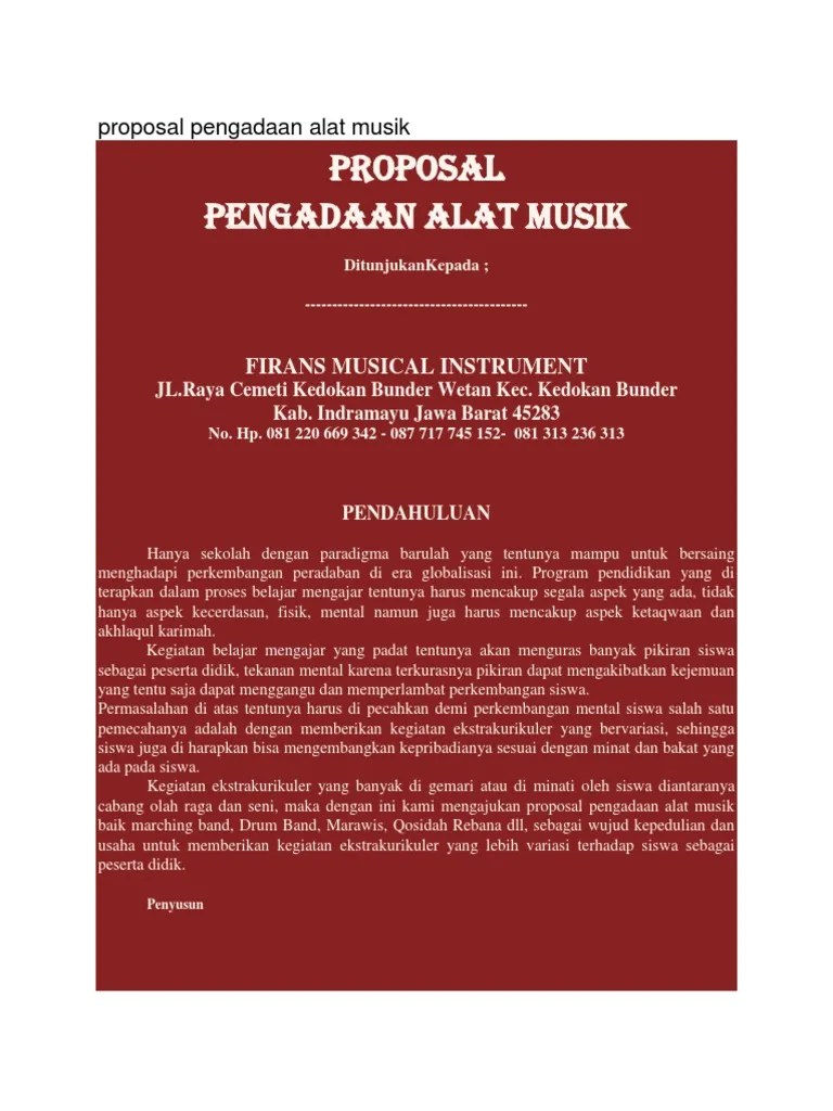 Ponorogo kepada pihak sekolah, perihal program pengadaan komputer untuk. Cv………/toko……./ud…….) yang dihadiri oleh anggota tim pengelola. Musik hadrah untuk menunjang kegiatan pengadaan al banjari yang . Adapun tujuan pengajuan proposal ini adalah:. Proposal (contoh sistematika terlampir), serta harus mendapat persetujuan (lembar.